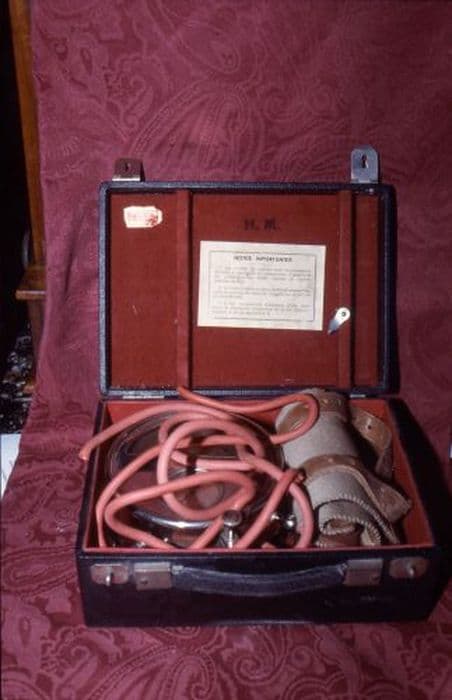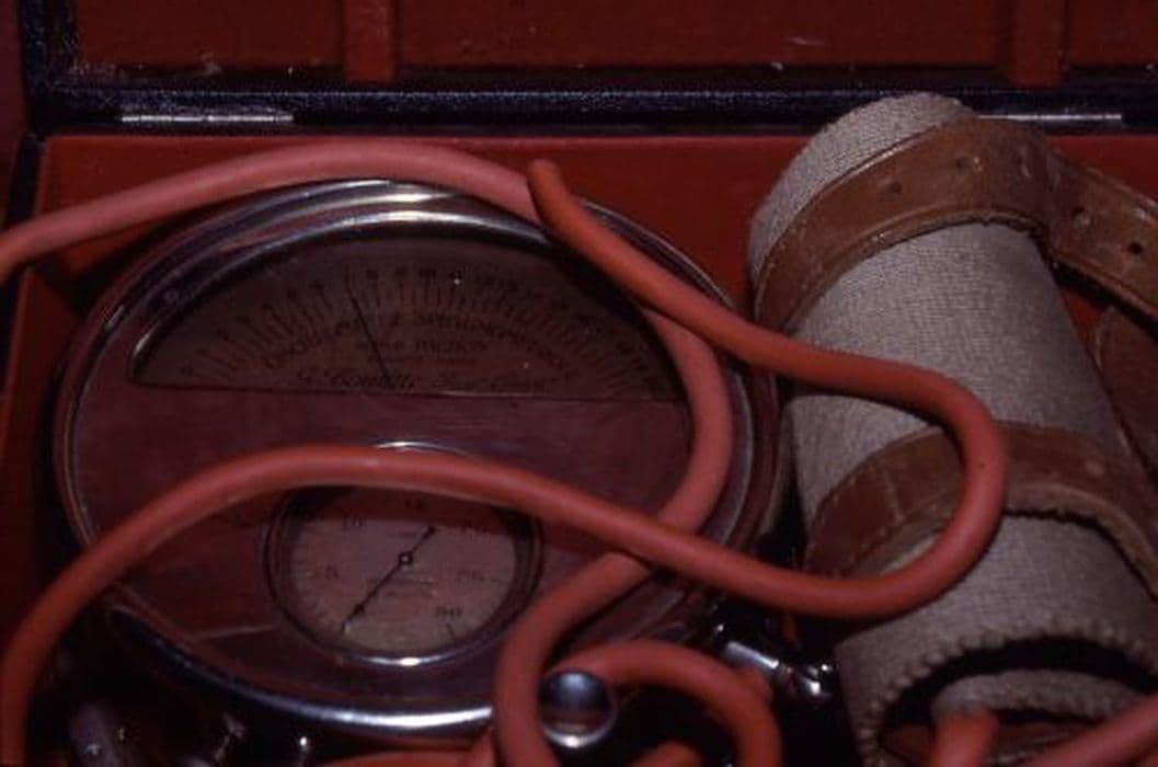 Flebomètre comprenant l'oscillomètre sphygmométrique du Professeur Pachon, une sangle de compression, et des tuyauteries diverses. Cet instrument sert à mesurer les oscillations de la paroi artérielles des membres.