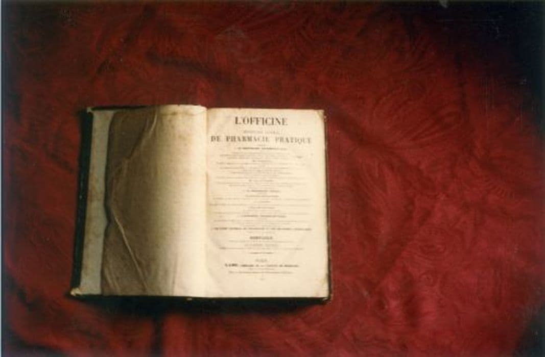 Deux tomes du Traité théorique et pratique de Julien-Joseph Virey, avec couverture en papier marbré rose, et dos en cuir havane.