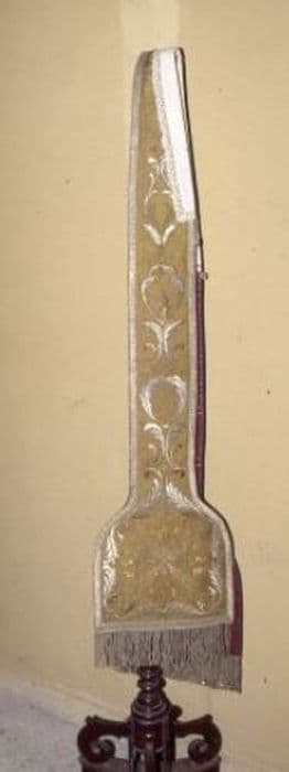 Etole pastorale en drap d’or, de forme palette. Croisette trilobée en relief de soies d’or, terminée par trois épis de blé métalliques dorés, le tout rayonnant de paillettes en sautoir, d’argent et d’or : guirlande de feuilles géométriques en relief de soies d’argent et d’or. Franges d’argent de sept centimètres. Doublure pourpre.