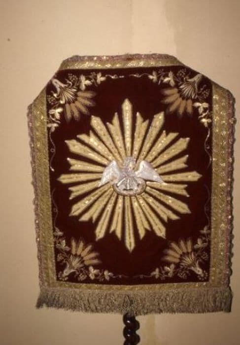 Devant de reposoir en velours cramoisi, brodé en relief. Bordure en passementerie droite de ruban et de sexte feuilles boutonnés. Franges d’or et doublure rouge.