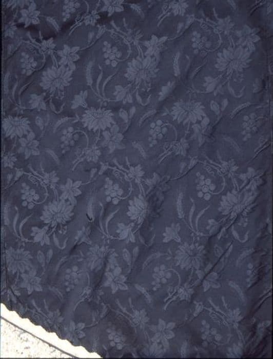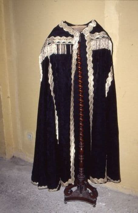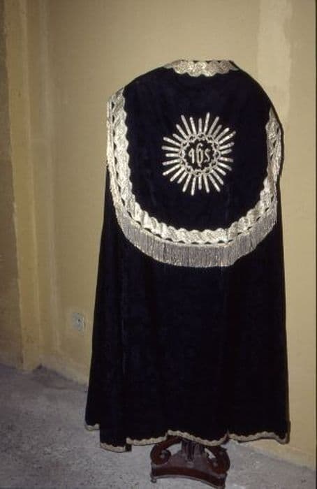 Chape en damas noir. Orfrois et chaperon dessinés par passementerie ondée feuilles de chêne et fleurettes boutonnées à six pétales d’argent. Motifs le tout en fils de soies brodés en relief d’argent, rayonnant de paillettes d’argent. Fermail en métal rond. Doublure noire.