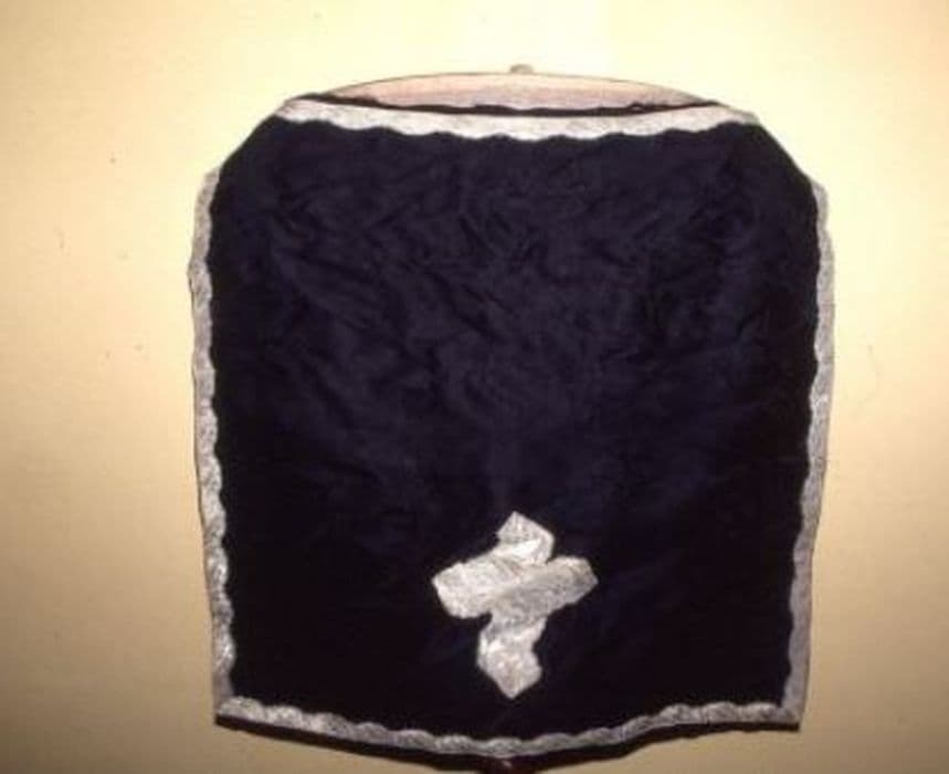 Voile de calice en damas noir. Croix grecque aiguisée de passementerie ondée feuille de chêne et fleurette boutonnée à six pétales. Doublure.