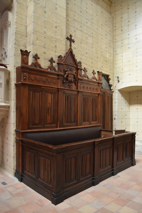 Banc d’oeuvre avec haut dossier en bois sculpté. Les panneaux sont décorés de plis en serviette et encadrés de pilastres. Le dossier est surmonté, au centre, d'un petit fronton portant les armoiries, sommé d'un croix.