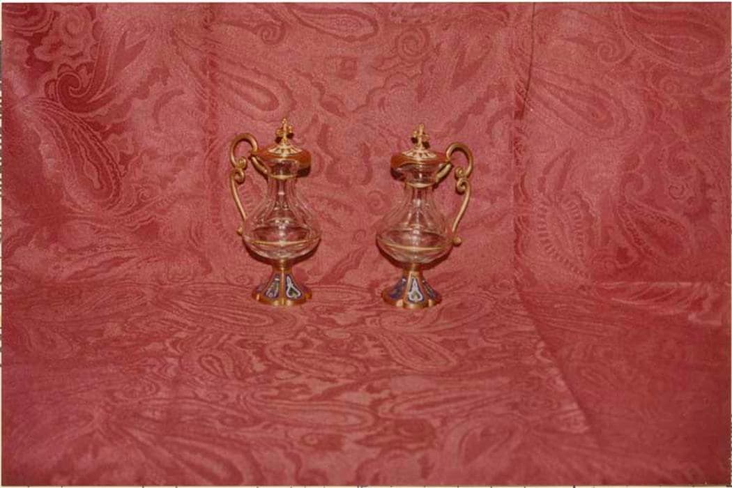 Ensemble en métal doré comprenant un plateau ovale en laiton et deux burettes à pied sextilobe, le tout dans un coffret parallélépipédique en bois recouvert de tissu noir et gainé intérieurement de tissu rouge. Les pieds sont décorés de six panneaux émaillés à fond bleu : motif fleuri vert et jaune dans un entrelacs blanc alternant avec un autre motif, une feuille verte aux extrémités arrondies jaunes et une fleurette bleu ciel. Cuve pansue en verre taillé. Anses en métal doré composé de deux volutes. Couvercle décoré d’un motif rayonnant autour d’une couronne perlée. Croix grecque tréflée.