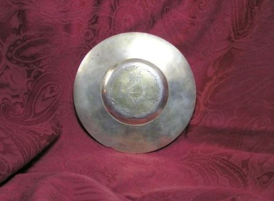 Patène gravée du monogramme du Christ, sommé d’une croix latine rayonnante et soutenu par un coeur percé des trois clous de la Passion, le tout entouré d’une couronne d’épines.