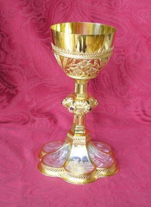 Calice néo-gothique en argent doré. Pied à six lobes, avec bordure ajourée, dessus orné de scènes de la Vie du Christ en métal blanc. Fût uni à six côtés. Noeud plat orné de feuilles d’acanthe et de boutons sertis d’améthystes. Fausse coupe ajourée, décor alterné d'épis de blé et cep de vigne. Coupe évasée.