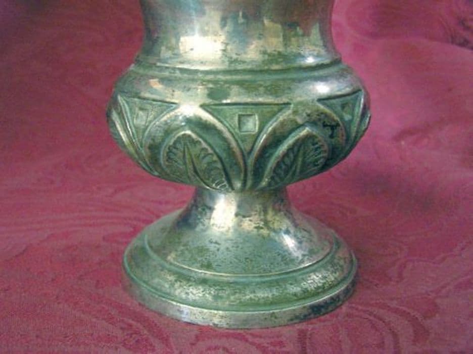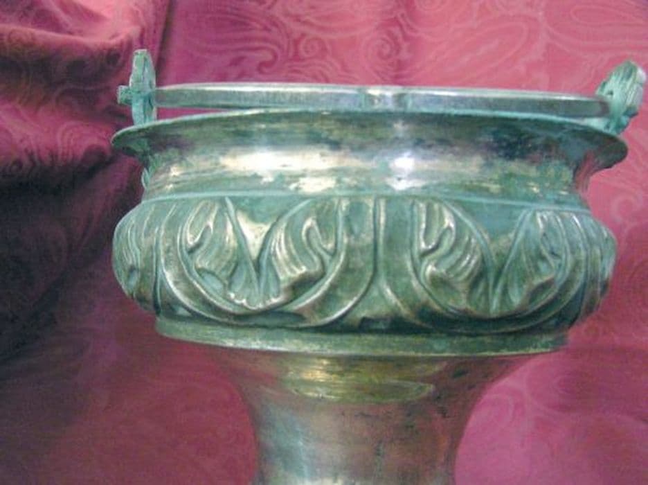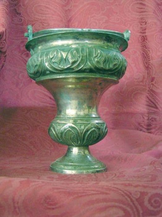 Seau à eau bénite en métal argenté. Pied circulaire à redent concave lisse. Cuve en forme de vase Médicis. Base ornée de feuilles stylisées. Panse lisse. Bordure décorée d'une large frise de feuilles d'acanthe. Bordure évasée.