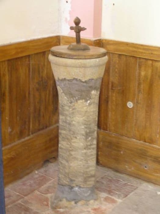 Cuve baptismale en pierre. Long fût hexagonal. Cuve semi cylindrique avec bourrelet au sommet.