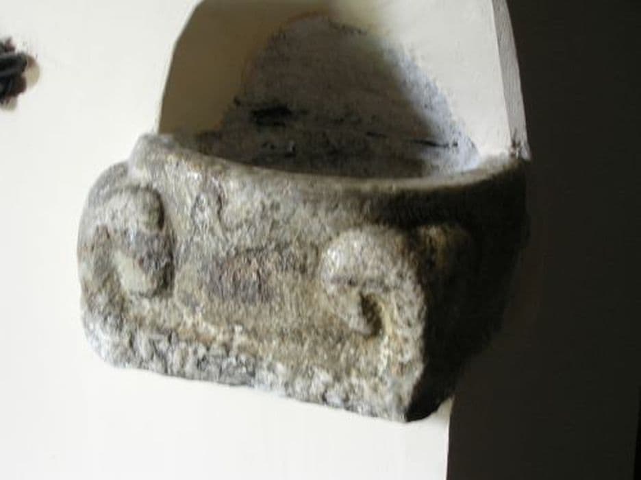 Bénitier en pierre décoré de volutes.