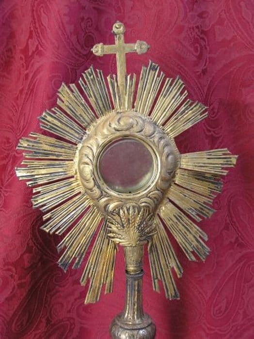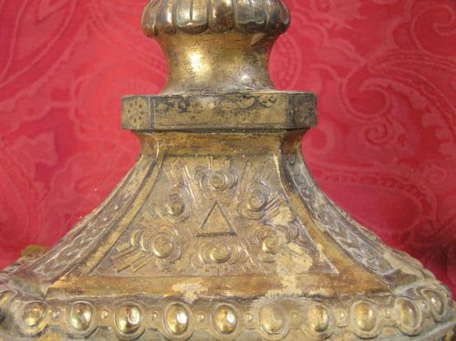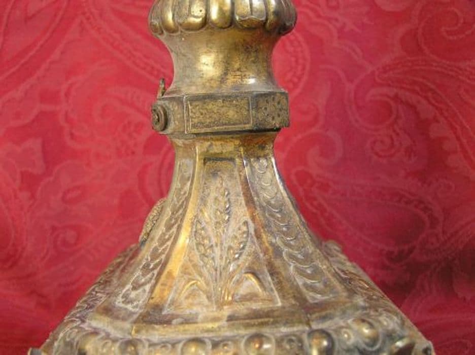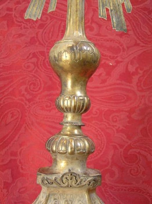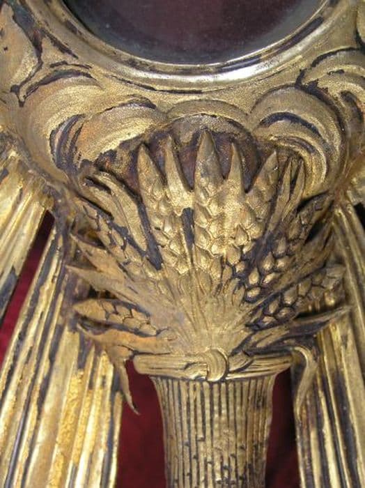 Base rectangulaire à pans coupés posée sur quatre volutes ailées sommée d’une bordure chargée d’opercules. Dessus pyramidal incurvé aux angles coupés orné d'une frise demi anneaux, chargé de motifs religieux, le tout surmonté d'une petite base rectangulaire à pans coupés, ornée d'un motif. Base du fût sommé d'une grosse collerette en côtes de melon. Noeud en forme d'urne décoré, en partie basse, de côtes de melon alternant avec des côtes au sommet recourbé, et en partie supérieure, de feuillages gravés. Fût cannelé chargé d’un bouquet d’épis de blés rapporté. Monstrance chargée de nuées. Gloire à rayons droits. Croix terminée par un engoulement.