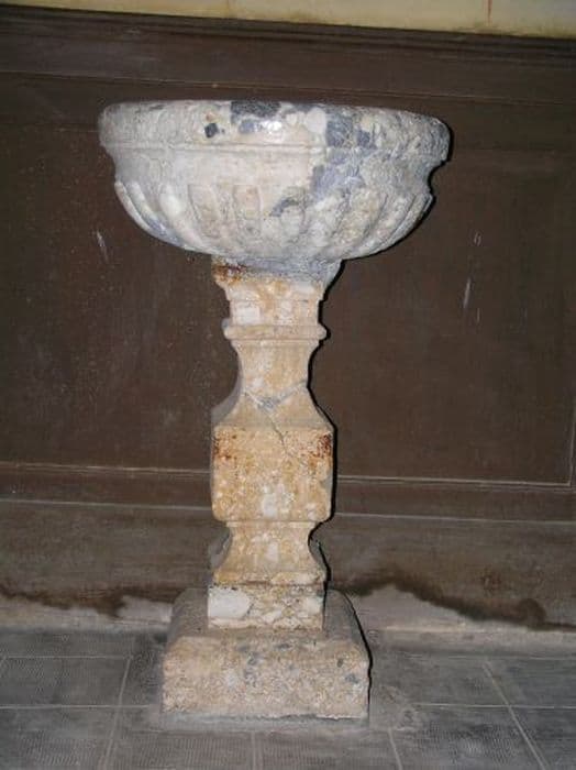 Pied carré. Fût à quatre côtés orné de redents à la base et au sommet. Cuve semi sphérique godronnée. Bordure supérieure en bourrelet.