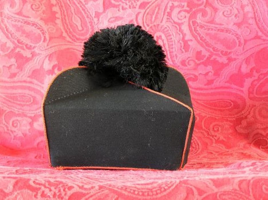 Barrette de chanoine à trois cornes en drap noir, bordée d'un filet violet, sommée d'une houppe en soie noire. Doublure violette.