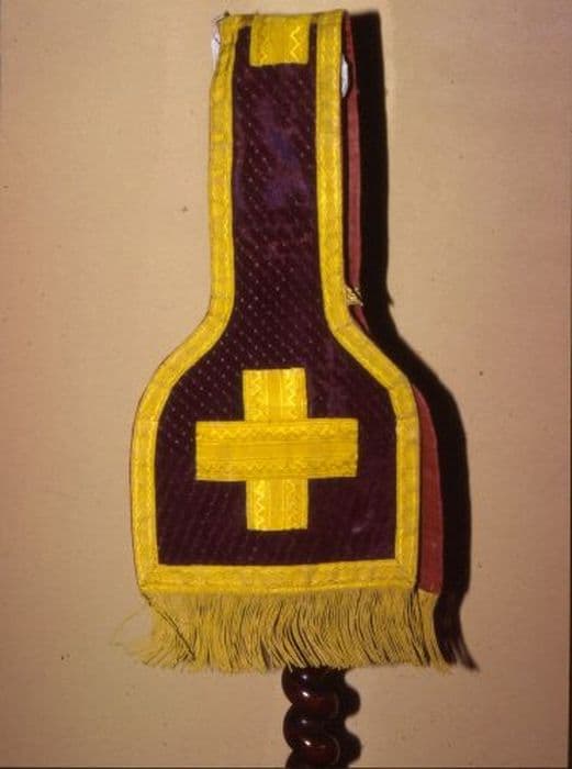 Manipule en plumetis violet, de forme palette assorti à la chasuble, avec croisette de passementerie droite jaune. Bordure de passementerie droite jaune. Franges jaunes. Doublure rose.