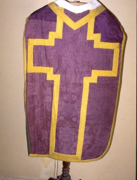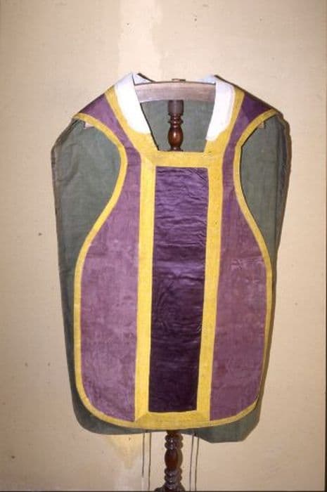 Chasuble en damas violet, ornée d'un grand bouquet dans un vase, soutenu par une guirlande de fleurettes et entouré d'un rinceau de grosses fleurs, de rivière de dentelle et d'épis de blé. Orfroi et croix à redents dessinés par une passementerie droite de coton jaune : grappes et feuilles de vigne stylisée. L'ensemble est bordé d'une passementerie jaune. Doublure verte.
