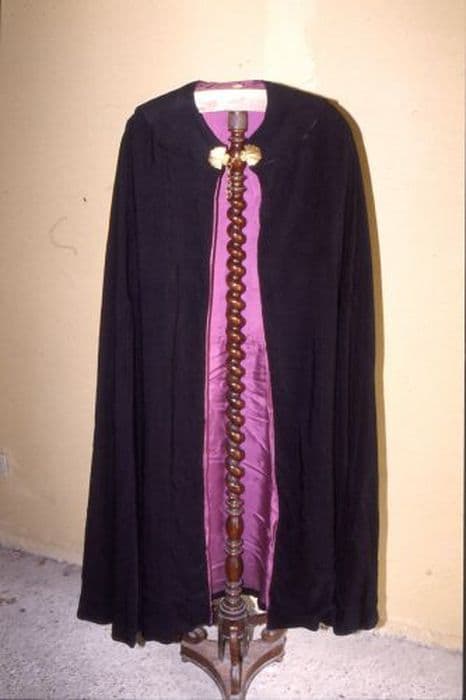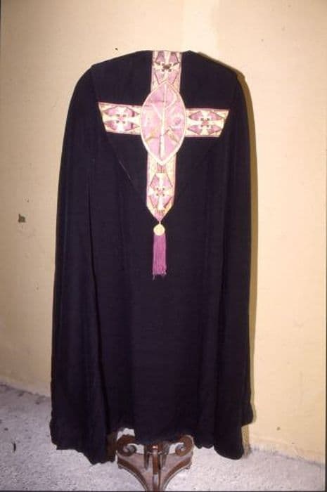 Chape néo-gothique en reps uni noir. Chaperon triangulaire chargé d'une large bande de passementerie droite de huit centimètres posée en croix, au fond de losanges mauve foncé chargés de croisettes pattées dorées ; en coeur, dans un grand ovale mauve foncé les lettres P et X cantonnées d'un A, du même. Gland violet de seize centimètres. Doublure violet rosé.