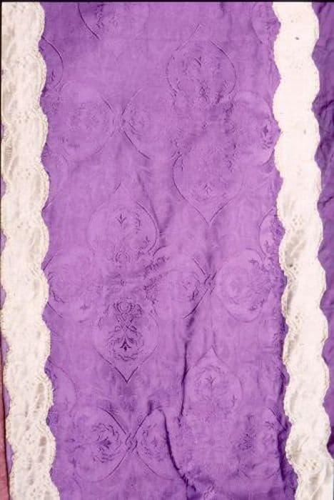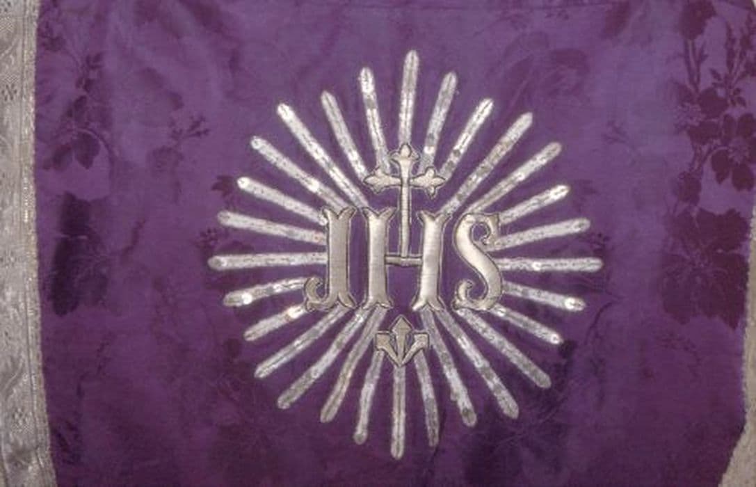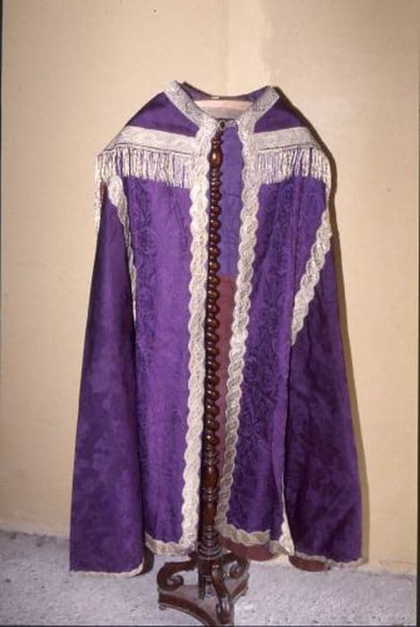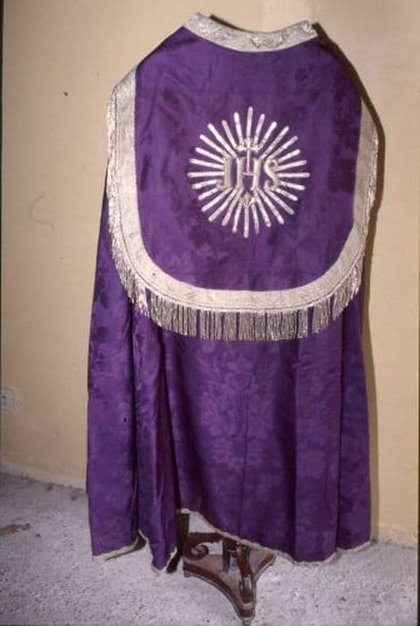 Chape composite en damas violet, ornée sur le devant d'une croisette fleurie terminée par des couronnes d'épines, dans des quadrilobes très allongé, reliés par des feuillages, et sur le dos d'une composition de roses, d'églantines, d'épis de blé et de grappes de raisin feuillées. Orfrois dessinés par passementerie ondée d'argent : feuille de chêne et fleurette à six pétales. Dosseret souligné par une passementerie ondulée identique, chargé en coeur d'un IHS en relief, brodé d'argent, soutenu par les trois clous de la Passion et sommé d'une croix fleurdelisée du même, le tout rayonnant de paillettes d'argent. Franges d'argent de sept centimètres. Doublure : vieux rose pour le bas et violet pour le haut.