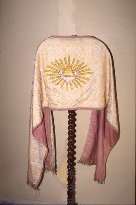 Voile huméral en damas blanc orné de quatre fleurs de tournesol posées en croix dans un quadrilobe et croisette fleurdelisée terminée par une couronne et chargé d'un sautoir, le tout jaune bouton d'or. Au milieu, en relief, triangle mystique rayonnant d'or, chargé de lettres hébraïques et soutenu par un nuage d'argent, le tout rapporté. Franges en coton rubis et jaune paille de quatre centimètres. Doublure vieux rose.