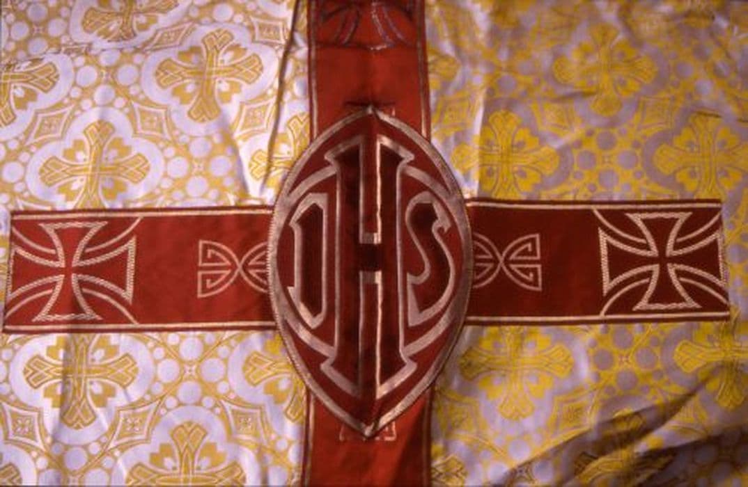 Voile huméral en damas blanc orné d'un décor de croisettes pattées bifourchées avec rayons stylisés jaune, le tout dans des quadrilobes très travaillés. Au centre, ajout d'une passementerie droite rouge, chargée de croix pattées d'or et surchargée, en coeur d'un losange rubis abritant un IHS d'or, brodé du même. Même décor sur le bras. Le tout bordé d'une passementerie fine droite : grappe de raisin feuillée. Franges d'or de cinq centimètres. Doublure rouge.