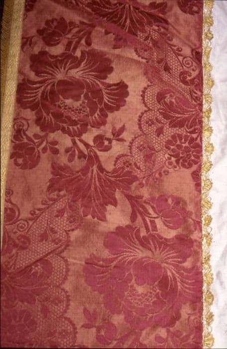 damas (blanc, rouge) : brodé ; fil métal (or)