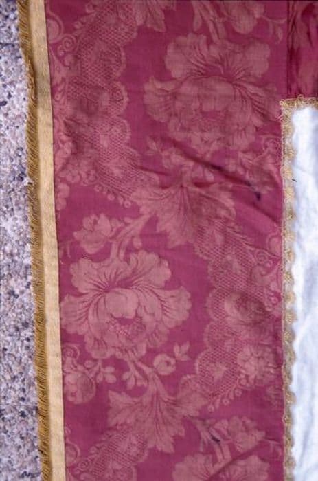 Bannière en damas blanc, double face, bordée d'un damas rouge à grosses fleurs et rivière de dentelle. Bordure extérieure de passementerie droite dorée : épis de blé, grappes de raisin et feuilles de vigne. Franges de coton jaune.