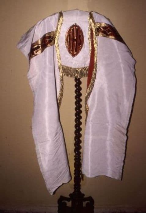Grémial en moire blanche. Bord inférieur à larges ondes. Sur les côtés, large bande de passementerie dorée et rouge, avec croix grenat bordé d'un liseré doré. Franges dorées. Doublure rouge.