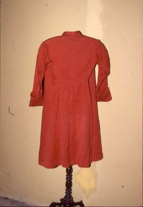 Tenue d'enfant de choeur en drap rouge. Col droit, petits boutons rouges, revers aux manches, plis en creux dans le dos. Sans doublure.