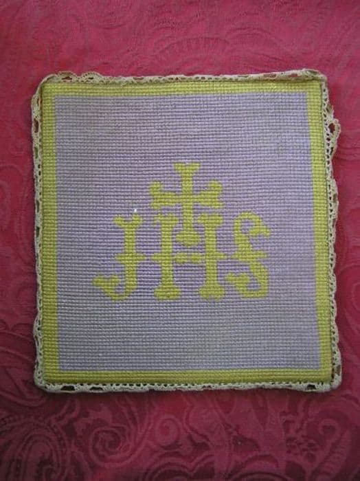 Pale en broderie au demi point sur canevas grège broché en coeur des lettres I sous forme de croix tréflée le H et l'S entrelacées, le tout rouille bordé de jaune foncé, frappées en coeur d'une croisette pattée jaune foncé, en bordure large décor broché de mêmes coloris. Bordure en dentelle métallique dorée.