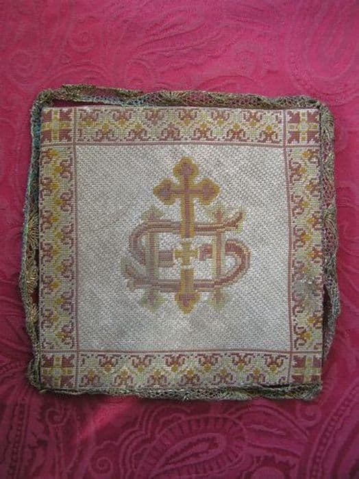 Pale en broderie au demi point mauve avec pour décor un IHS gothique jaune sommé d'une croix grecque bifourchée et une bordure, le tout jaune. Bordure de dentelle écrue.