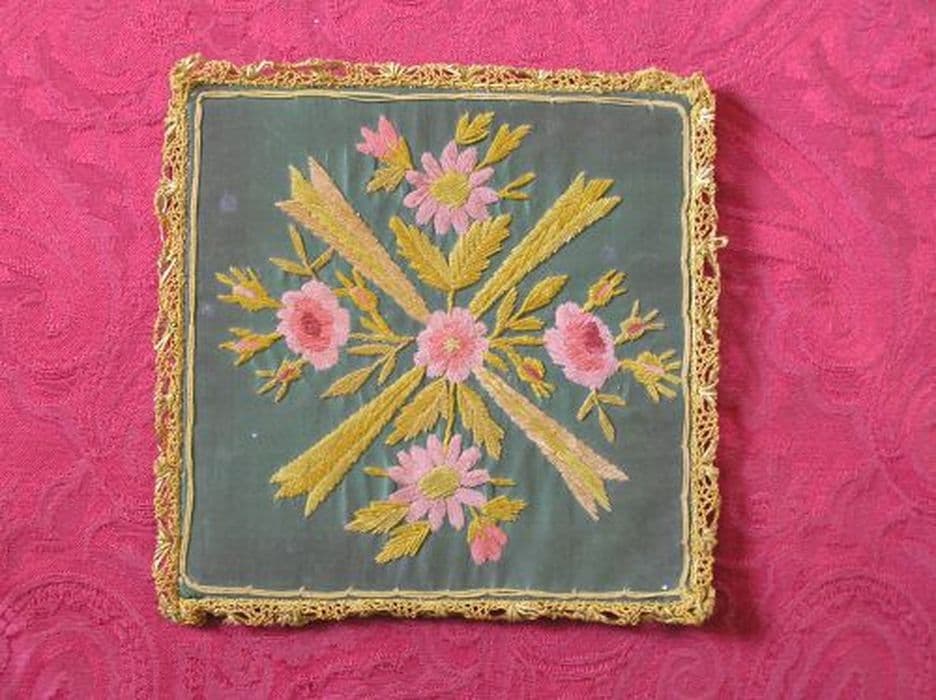 Pale en taffetas vert amande brodé d'une croix grecque de roses au naturel et de marguerites rosées au coeur jaune, tigées de jaune, frappée au centre d'une rose, le tout rayonnant de jaune entouré d'un double filet de broderie au passé et point de tige en chenille de soie polychrome (roses et jaunes), bordées de dentelle jaune.