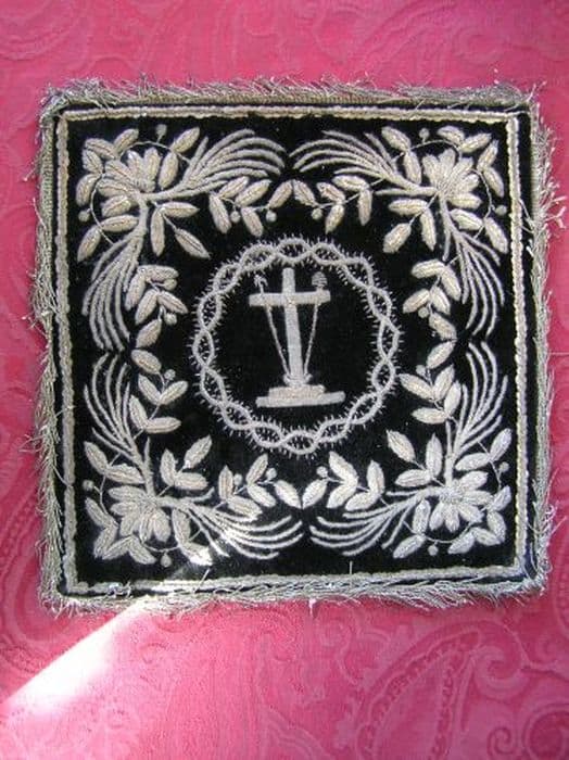 Pale en velours noir chargé d'une croix latine sur socle accompagnée d'une lance et d'une éponge au bout d'un roseau brodées en canetille argent, insérées dans une couronne d'épines du même. Autour, une frise de feuillages stylisés en canetille et paillettes argent, encadrées d'un filet du même. Bordée d'une frange d'argent.