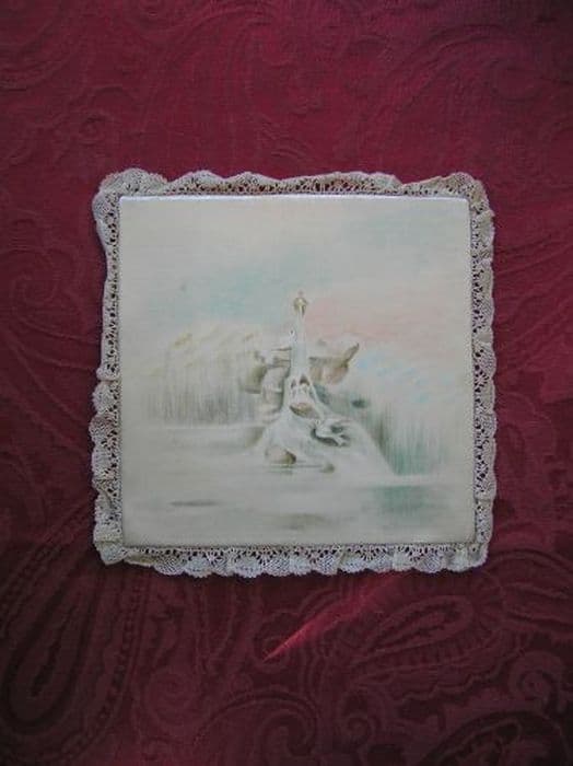Pale en satin mat blanc pinceauté : ciboire doré, posé sur un rocher du même, duquel s'écoule une source à laquelle s'abreuve trois colombes. Bordure en dentelle de coton écru.