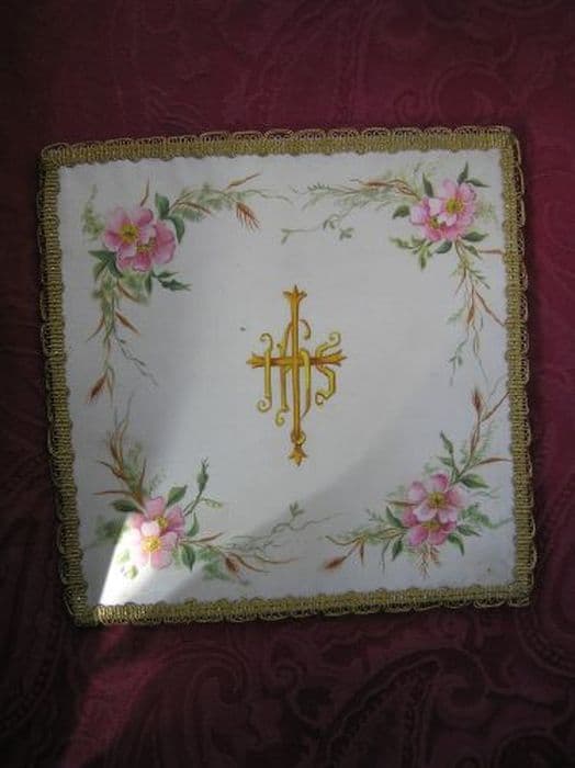 Pale en satin mat blanc pinceauté : IHS en lettres gothiques dorées entravaillées avec une grande croix grecque tridentée effet vieil or, cantonnés d'églantines tigées et feuillées au naturel. Bordure en passementerie métallique vieil or.