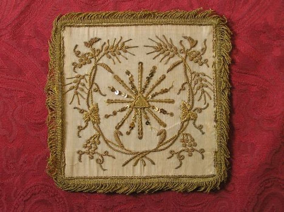 Pale en gros de Tours crème, brodé en coeur du triangle mystique (appliqué drap d'or), rayonnant de paillettes et de canetille d'or, entourés d'une couronne d'épis de blé et de grappes de raisin du même, le tout encadré par un filet torsadé. Bordure en franges de filé doré.