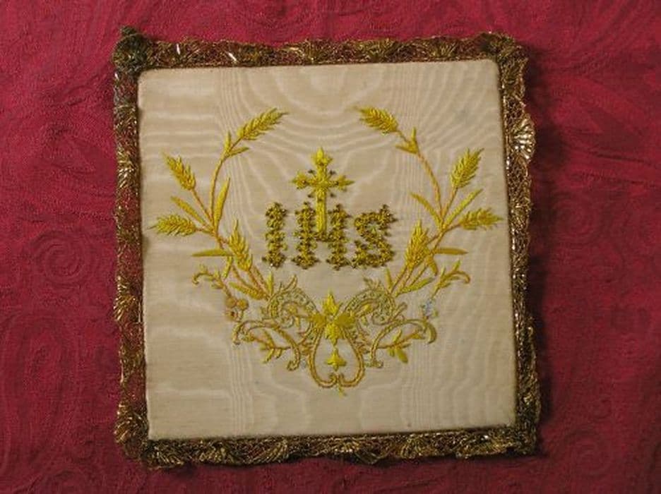 Pale en moire moderne beige brochée en coeur d'un IHS en lettres droites et sommé d'une croix latine tridentée rayonnante jaune, ornées de perles mécaniques dorées, entouré d'un décor d'épis de blé en coton jaune (passé, point de tige, point de noeud et paillettes). Bordure en dentelle métallique au fuseau dorée.