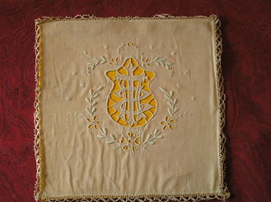 Pale en lin blanc brodé et ajouré au centre laissant apparaître un IHS en travaillé avec une croix latine tridentée sur fond de satin bouton d'or, l'ensemble soutenu et sommé par un motif fleural. Bordure en coton.