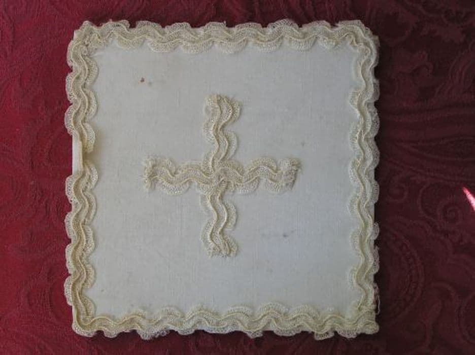 Pale en lin blanc avec broderie d'application (galon appliqué) d'une croix grecque ondée, encadrée d'une frise ondée (même galon).