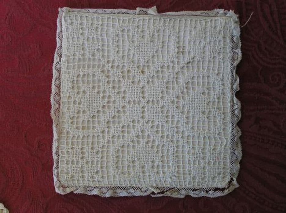 Pale en crochet blanc, brodé d'une croix grecque rayonnante. Bordure en dentelle.