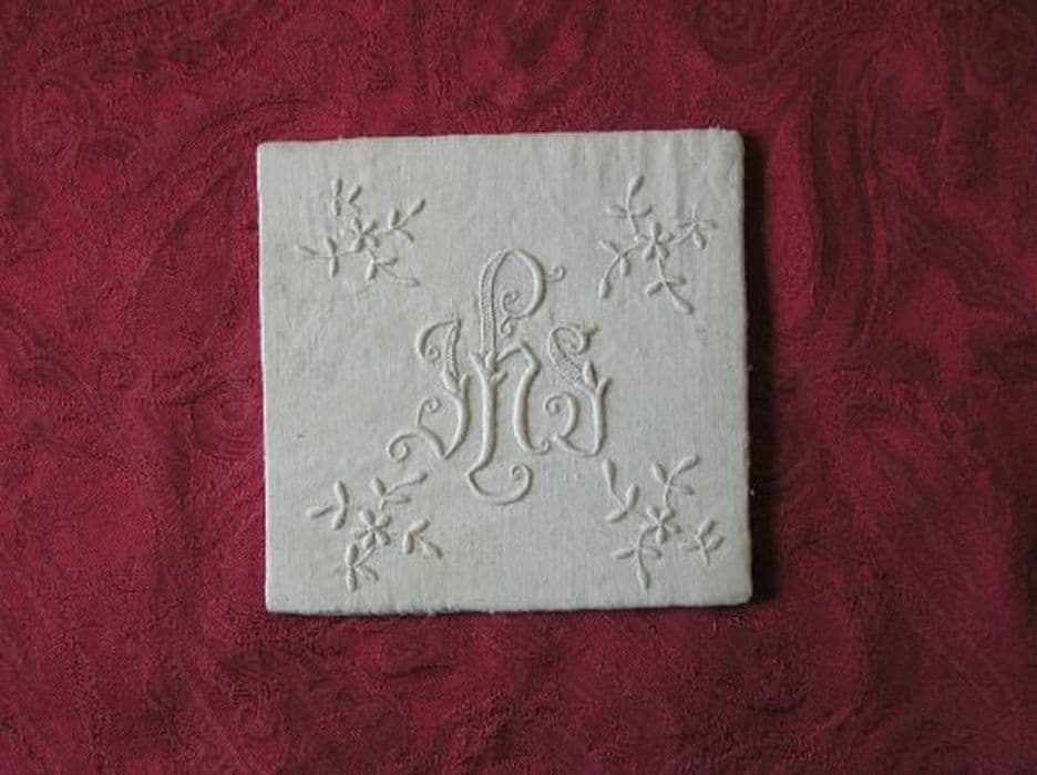Pale en lin blanc uni brodé au passé des lettres IH et S en italique gothique, cantonnées d'un petit motif fleuri.