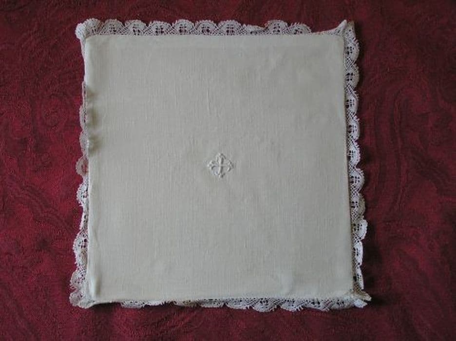 Pale en lin blanc uni brodé au passé d'une croisette bifourchue boutonnée. Bordure en dentelle.
