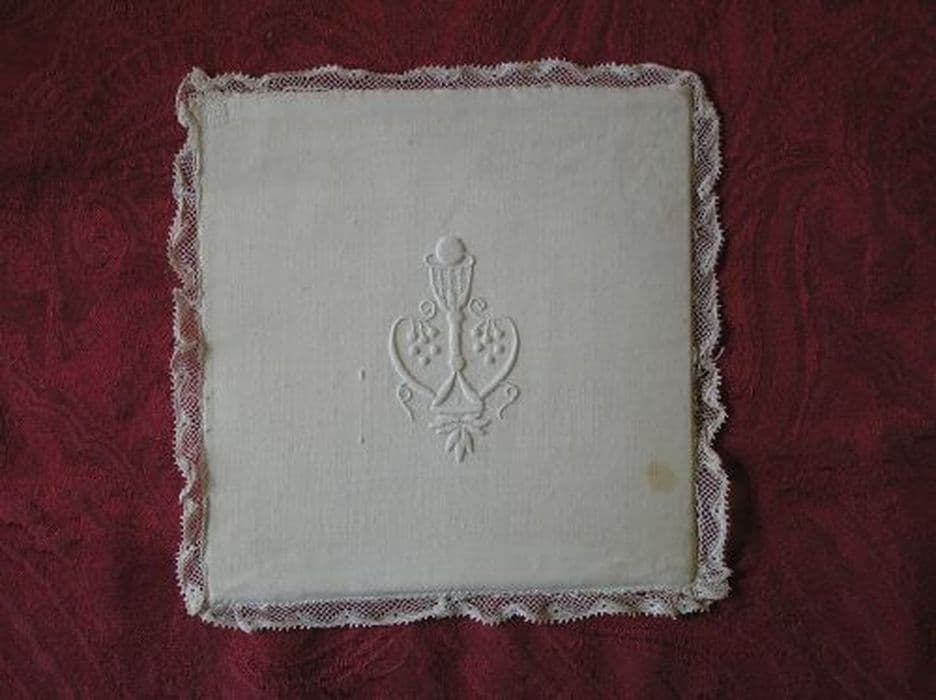 Pale en lin blanc uni brodé au passé. Bordure en dentelle.