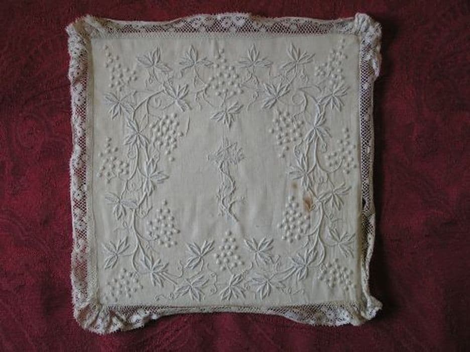 Pale en lin blanc uni brodé au passé en relief. Bordure en dentelle.