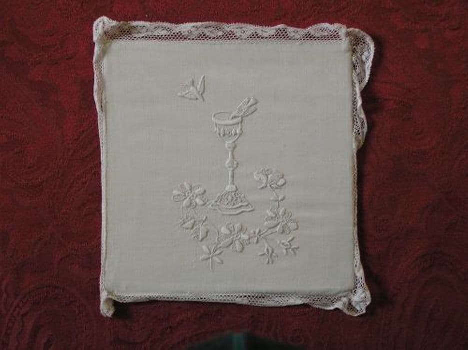 Pale en lin blanc uni brodé au passé en relief. Bordure en dentelle.