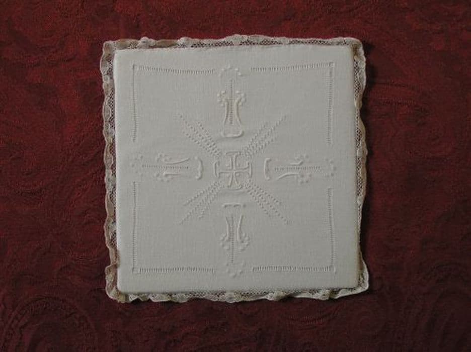 Pale en lin blanc uni brodé au passé et ajouré d'une croisette potencée rayonnante, les bras prolongés par un petit motif baroque. Encadré par un filet de jours. Bordure en dentelle.
