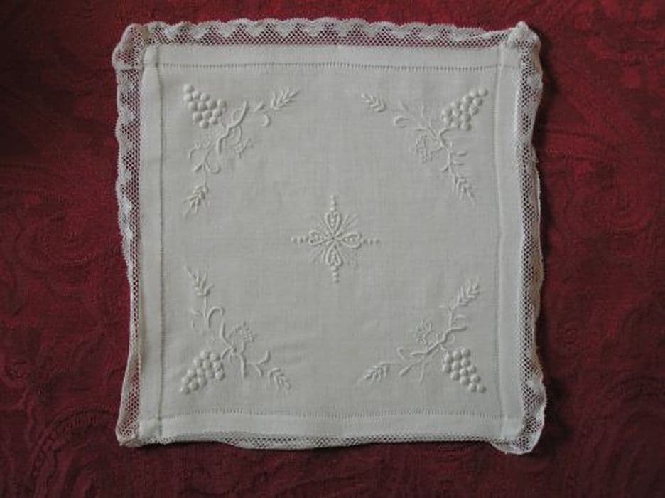 Pale en lin blanc uni brodé au passé, encadré par un filet de jours. Bordure en dentelle.