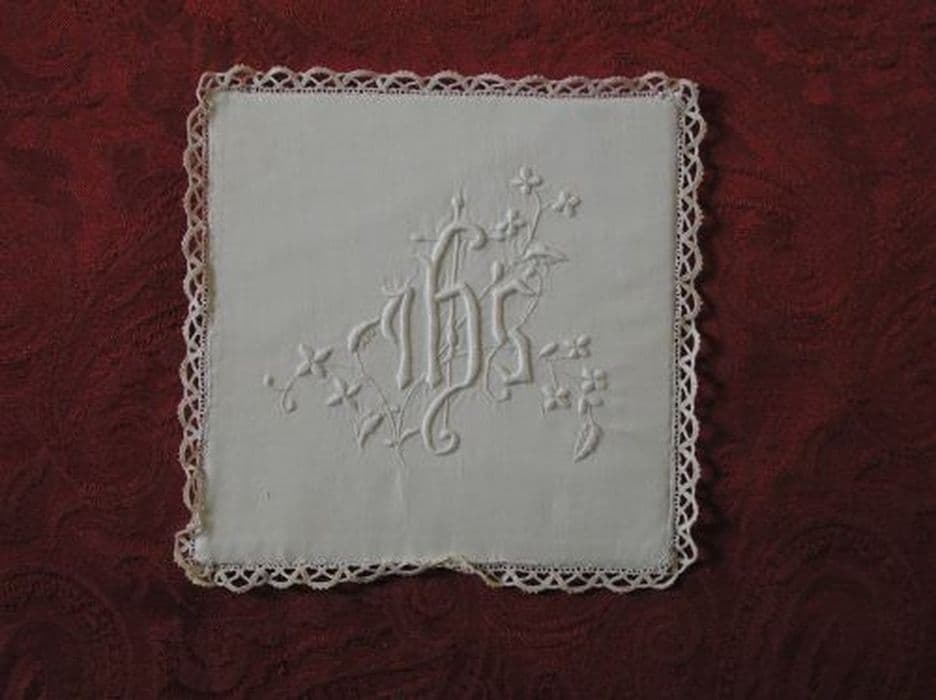 Pale en lin blanc uni brodé au passé et point de bourdon, en relief et un décor de petite bordure en dentelle.