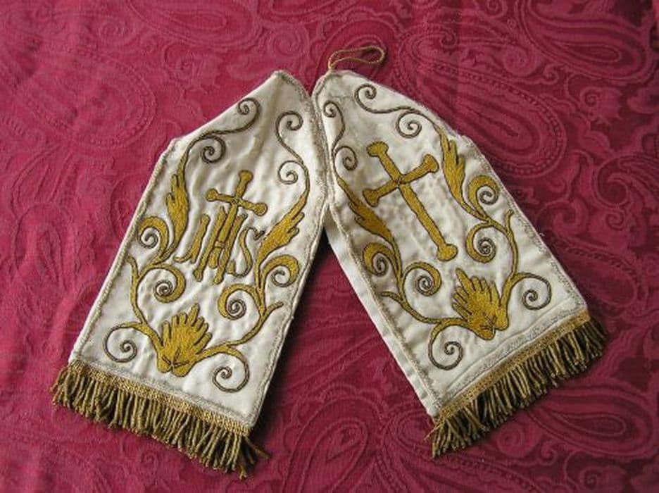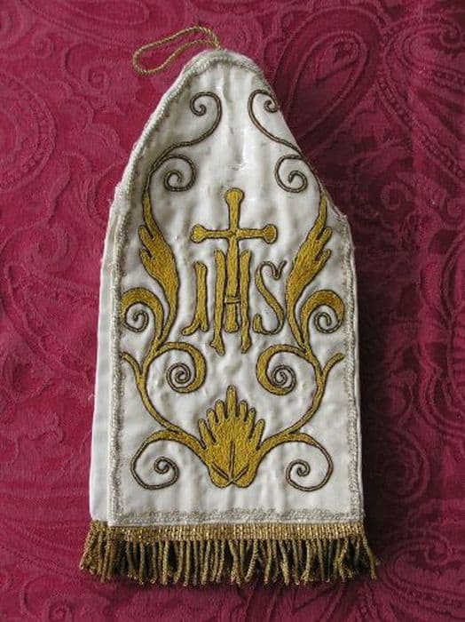 Pavillon de ciboire en gros de Tours crème à quatre pans brodés de soies jaunes, marron et filé d'or. Petit galon en passementerie d'or. Franges dorées. Doublure en satin crème.