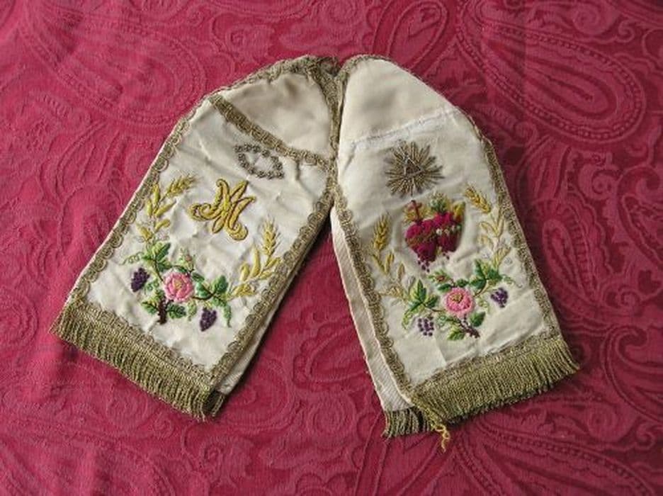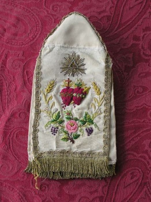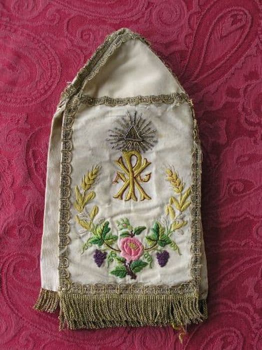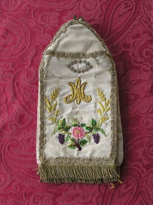 Pavillon de ciboire en gros de Tours crème à quatre pans, brodés de soies polychromes au passé, point de noeud et point de tige. Petit galon ondé en passementerie or, franges dorées de deux centimètres. Doublure crème.