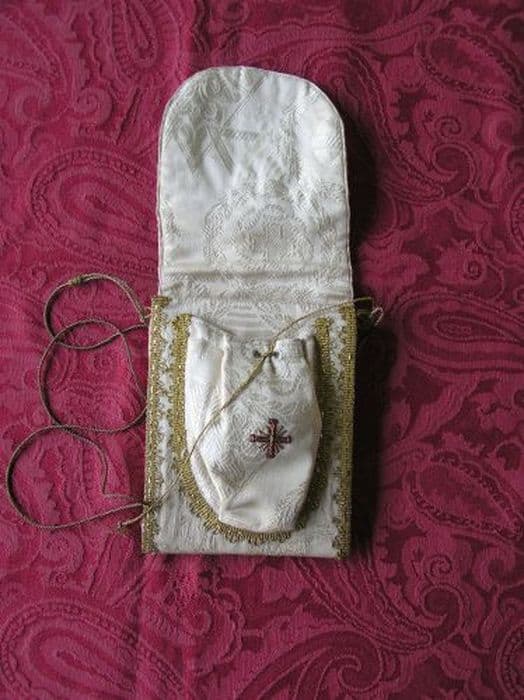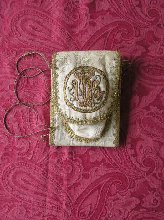 Pochette porte viatique en damas brodé en couchure filé or, canetille or, pointe de tige pour les soies roses et cramoisi. Bordure en fine passementerie dorée. Doublure de satin crème.