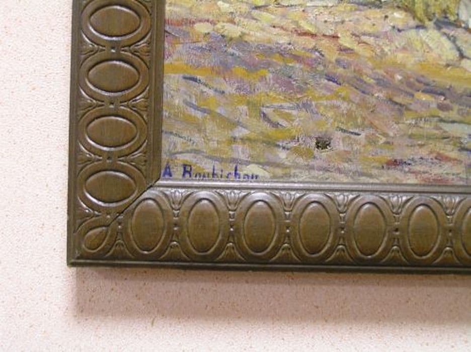 Toile peinte avec cadre en bois décoré d'une frise d'ovales.