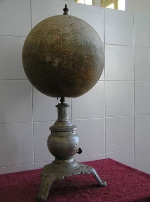 Appareil reproducteur des courants atmosphériques. Base tripode en fonte, base sphérique intégrant un mécanisme de rotation par manivelle extérieure. Sphère terrestre.